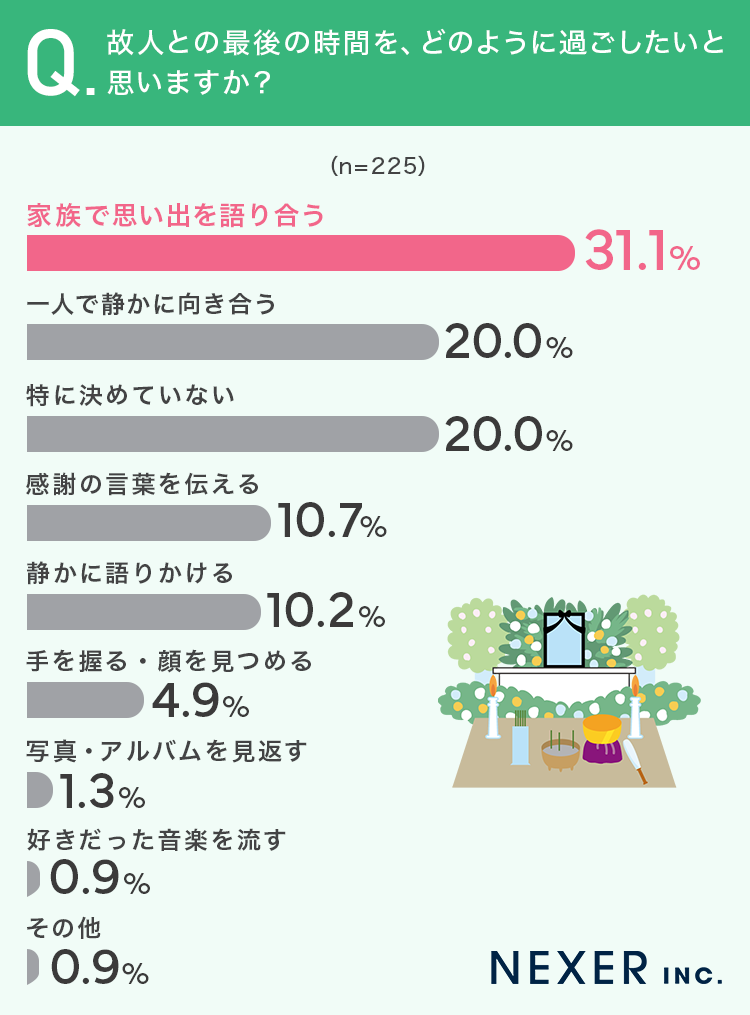 その結果、31.1%が「家族で思い出を語り合う」と回答し、最も多い結果となりました。次に「一人で静かに向き合う」「とくに決めていない」がそれぞれ20.0%となっています。