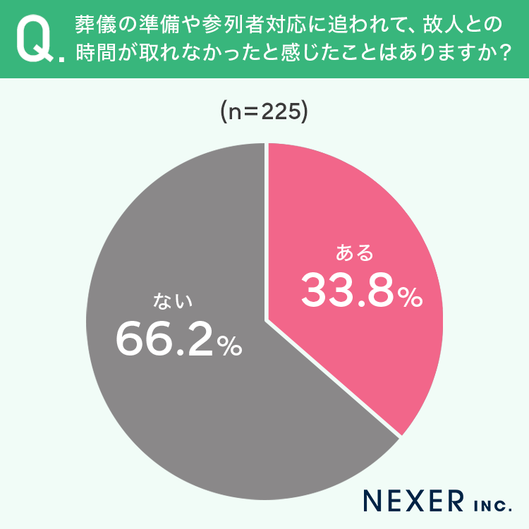 その結果、33.8%が「葬儀の準備や参列者対応を理由に故人との時間が取れなかった」と感じたことが「ある」と回答しました。