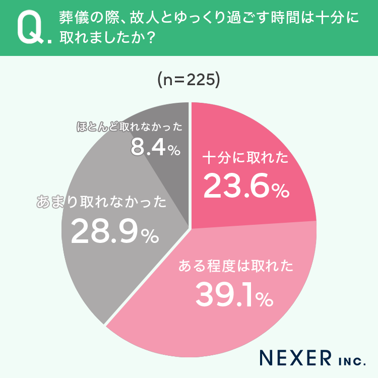 その結果、28.9%が「あまり取れなかった」・8.4%が「ほとんど取れなかった」と回答しました。この結果から、葬儀の場が必ずしも故人と向き合うための時間になっていない実態が浮き彫りになっています。